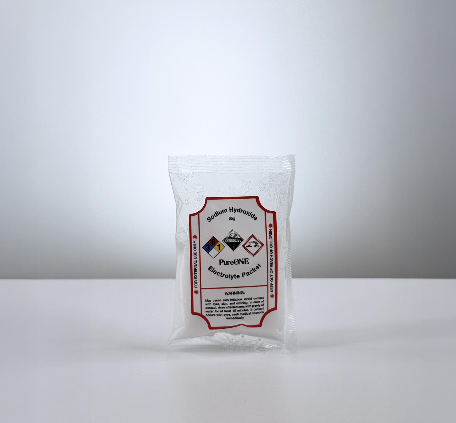 Each bag contains three 65-gram pouches of electrolyte (lye) powder/crystals.